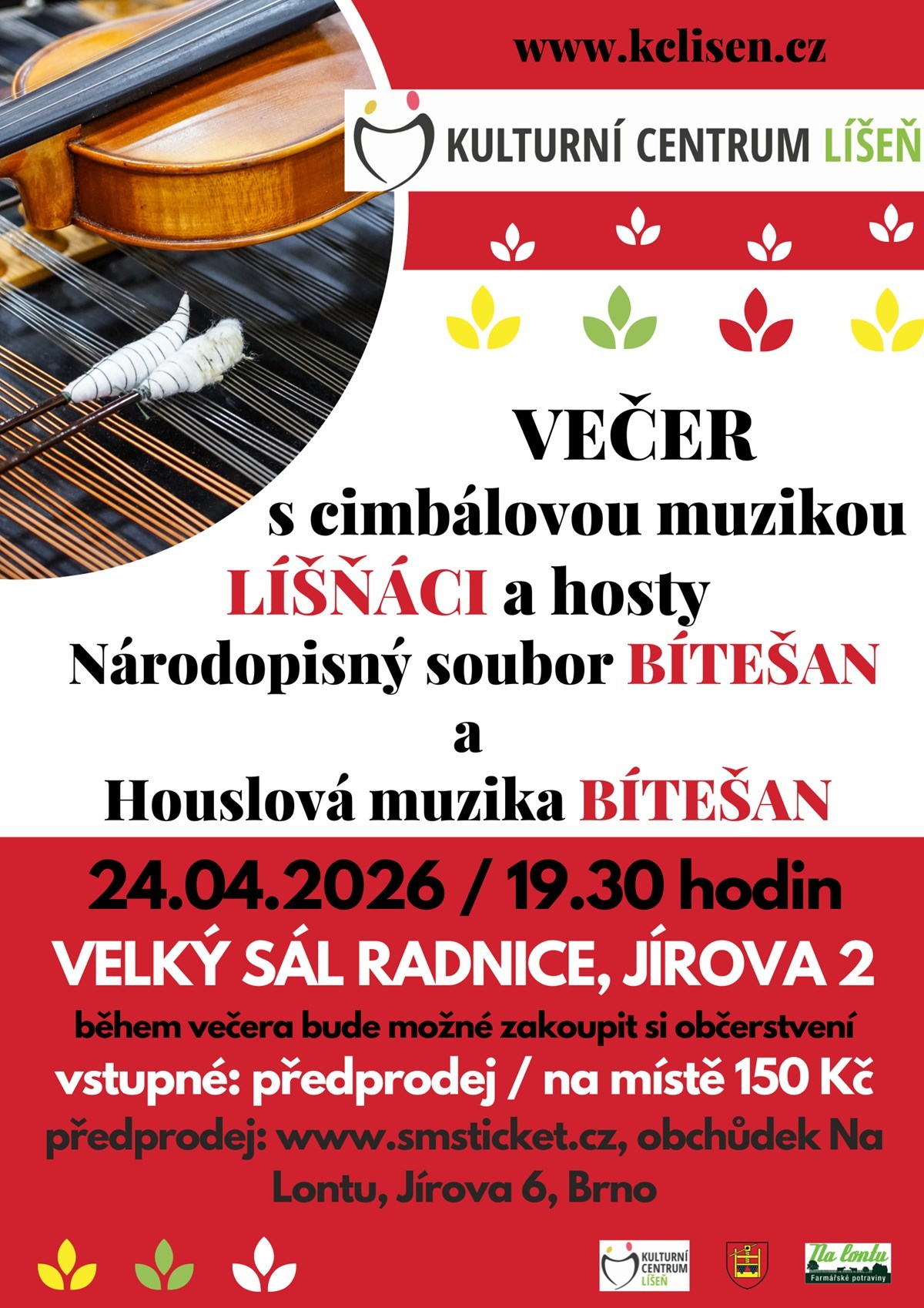 Pátek 24.04.26 v 19.30 VEČER U CIMBÁLU Přijďte si zatancovat, poslechnout i zazpívat oblíbené i méně známé lidové písně v podání Cimbálové muziky Líšňáci a jejich hostů. Můžete se těšit na uvolněnou atmosféru, zpěv, občerstvení a taneční parket, na kterém rozhodně nebudete sami!
