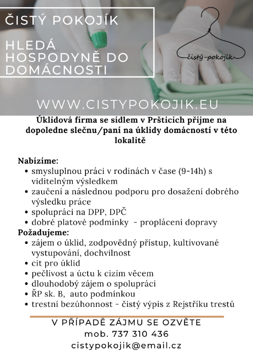 V případě zájmu volejte +420 737310436 nebo pište cistypokojik@email.cz