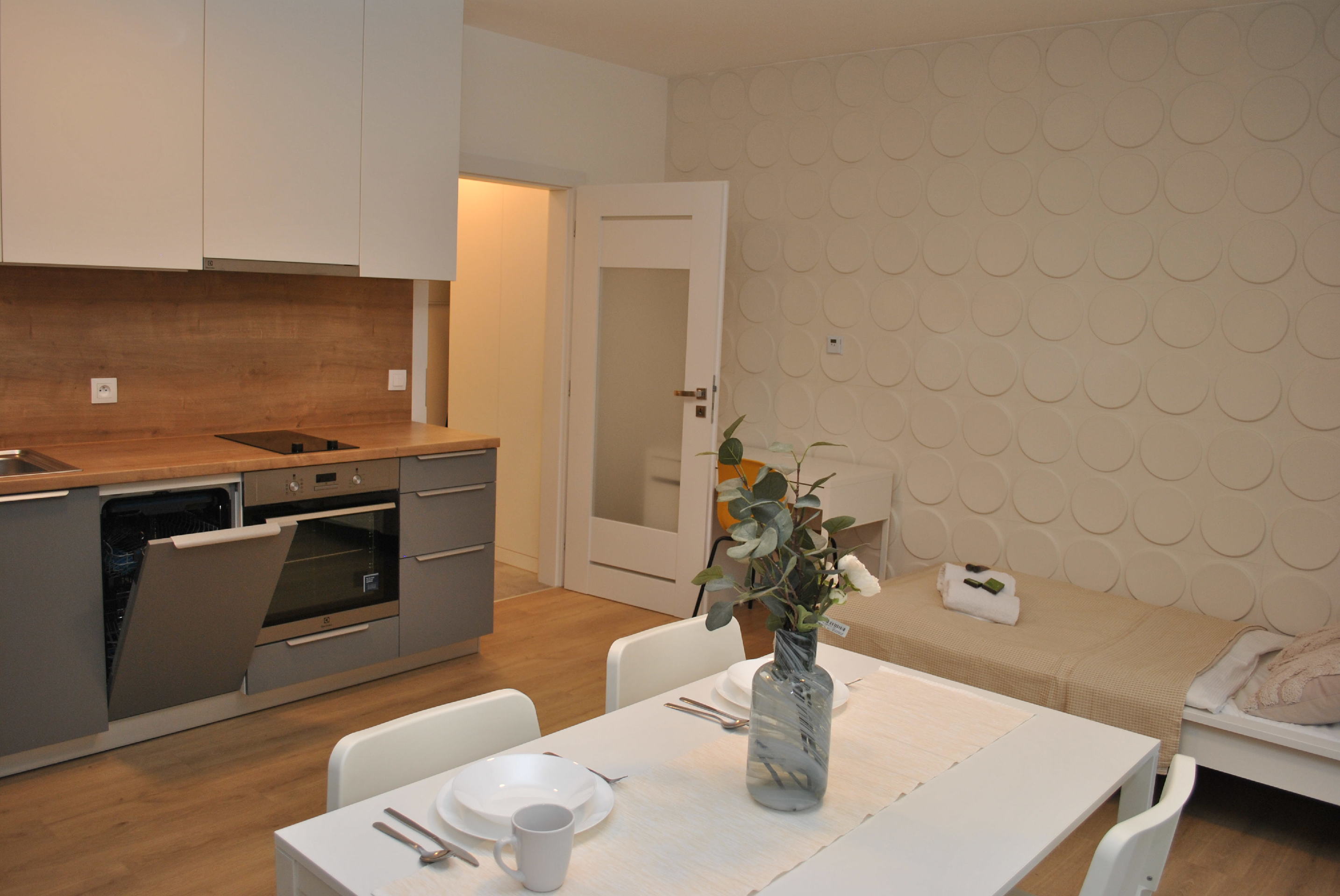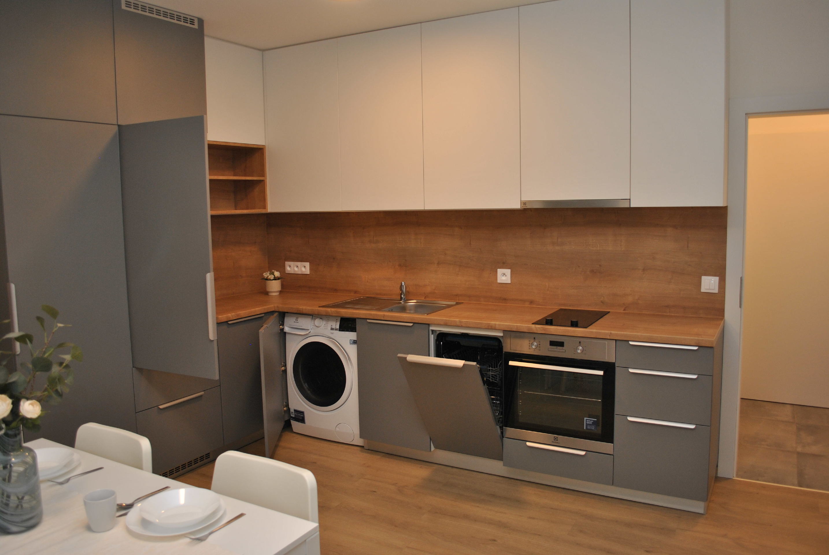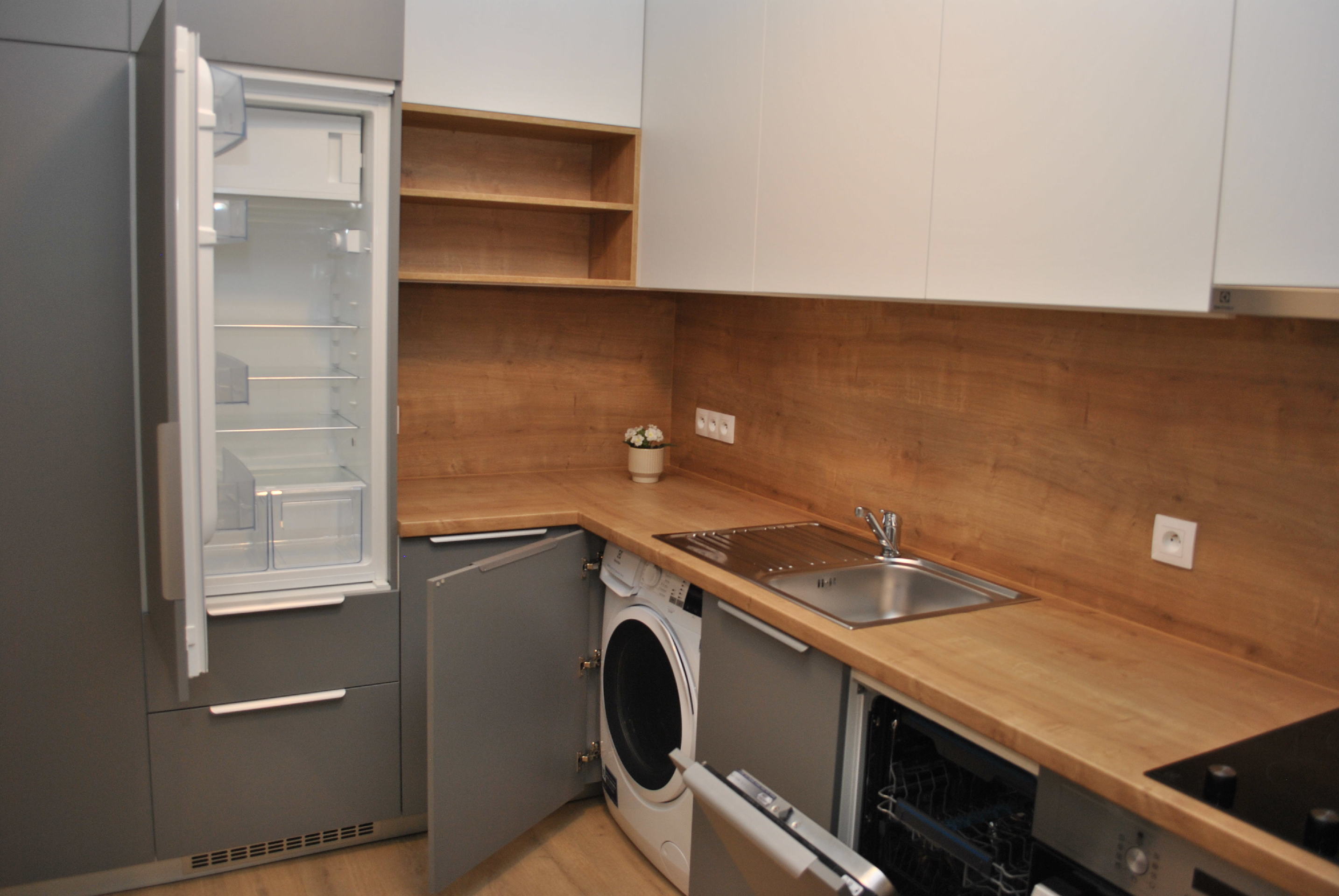 V bytě je chytře řešený úložný prostor pomocí vestavěných skříní. V bytě je trouba s varnou deskou, myčka nádobí, lednice s mrazákem a pračka.