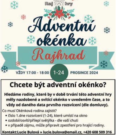 Všichni si vzpomeneme, s jakou radostí i my jsme otevíraly okénka v adventním kalendáři. A naše rajhradská adventní okénka si děti otevíraly na procházkách v předešlých dvou letech a letos je to čeká opět. 24 rodin z Rajhradu se domluví a nazdobí svá okna vč. čísla, které bude označovat den prvního rozsvícení. V den prvního rozsvícení si některé z rodin mohou připravit i program či dárek. Adventní okénka se rozsvítí v daný den a svítit budou až do konce roku 2024. Děti si mohly u prvního okénka vyzvednout herní plán a v něm si vymalovat domeček, který bude mít stejné číslo jako okénko, které navštíví. Zpříjemněte si procházky v adventní době a užijte si napětí při hledání adventních okének.