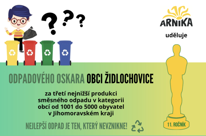 Město Židlochovice se zúčastnilo 11. ročníku soutěže Odpadový Oskar za rok 2024, kterou vyhlašuje organizace Arnika. Odpadový Oskar je soutěž, jejímž cílem je popularizace obcí, které produkují méně než 150 kg směsných komunálních odpadů na jednoho obyvatele a rok. S velkou radostí oznamujeme, že naše město získalo třetí místo za nejnižší produkci směsného odpadu v kategorii obcí od 1001 do 5000 obyvatel v Jihomoravském kraji. Touto cestou bychom chtěli poděkovat občanům za jejich úsilí při třídění odpadu, které je klíčové pro ochranu životního prostředí a úsporu financí. Vaše poctivost a aktivní přístup pomáhají městu dosahovat lepších výsledků v recyklaci, což umožňuje efektivnější nakládání s odpady pro budoucnost.