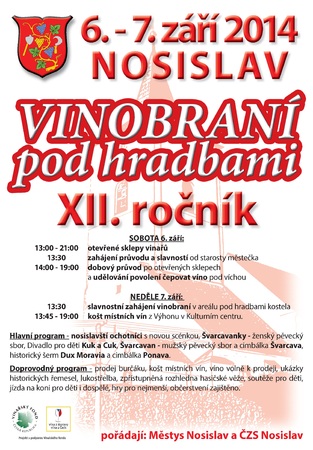 Máte už plány na víkend 6.-7. září? A co zkusit XII. ročník Vinobraní pod hradbami v Nosislavi? V sobotu budete moci navštívit otevřené sklepy a okoštovat vína místních vinařů. V neděli je hlavním lákadlem košt vín z přírodního parku Výhon, který je významnou vinařskou lokalitou s tradicí sahající až k počátkům vinařství na našem území. Víno budete moci nejenom okoštovat, ale také samozřejmě koupit.