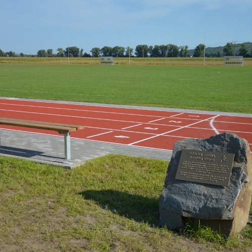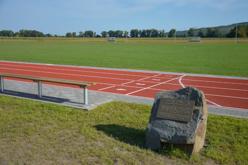 Hlavní zásluhu na vybudování tohoto pěkného sportovního areálu má starosta obce Přísnotice Ing. Zdeněk Mahovský, který při slavnostním otevření běžecké dráhy současně odhalil pamětní desku s nápisem „Běžecká dráha Františka Němce“ věnovanou zakládajícímu členovi a dlouholetému trenérovi atletického oddílu panu Františku Němcovi.