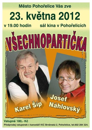 Město Pohořelice zve ve středu 23. května na "Všechnopartičku" s Karlem Šípem a Josefem Náhlovským do sálu Kina. Akce začíná v 19 hodin a za vstupné zaplatíte 180 korun. Vstupenky si můžete zakoupit v Kulturním informačním středisku na adrese Brněnská 2, nebo objednat na telefonním čísle 602 284 324.