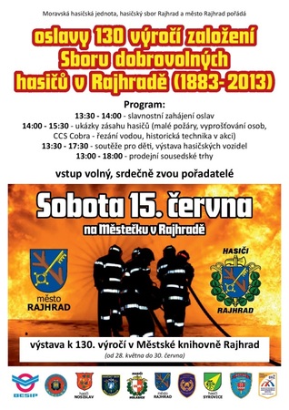 Sbor dobrovolných hasičů v Rajhradě slaví 130. výročí svého založení. Při této příležitosti pořádají hasiči v sobotu 15. června oslavy. Ještě předtím však bude v městské knihovně k vidění tematická výstava, která má vernisáž v úterý 28. května v 18 hodin. Vernisáž zpestří svou přednáškou o historii rajhradského hasičského sboru J. Sedláček. Návštěvníci se mohou na expozici přijít podívat až do 30. června.