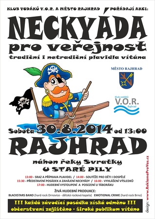 Rajhradští vodáci a město Rajhrad připravili na samý závěr prázdnin Neckyádu. Bude se konat v sobotu 30. srpna od 13:00 u staré pily. K vidění budou tradiční i netradiční plavidla, připraveny jsou soutěže pro děti i dospělé a chybět nebude ani posezení u táboráku a hudební doprovod v podání Blackstars Band z Drnovic a Emotional Crime z Brna.
