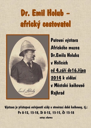 Dr. Emil Holub. Kdo by ho neznal? Slavný lékař, etnograf a cestovatel z Holic se proslavil na celém světě díky svým africkým výpravám a rozsáhlým etnografickým výzkumům. Od 4. září do 16. října bude Městská knihovna v Rajhradě hostit putovní výstavu Afrického muzea Dr. Emila Holuba v Holicích. K vidění budou fotografie mapující život a práci Dr. Holuba, reprodukce jeho kreseb a mnohé další zajímavosti. Výstava je přístupná vždy v pondělí (8-12 hod, 13-18 hod), středu (8-12 hod, 13-15 hod) a čtvrtek (13-18 hod). Vstup je zdarma.