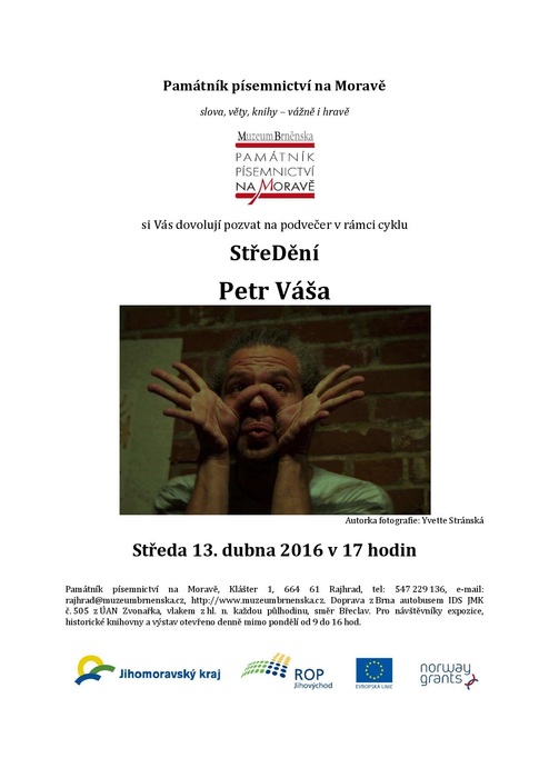S Petrem Vášou se můžete setkat ve středu 13. dubna od 17:00 v rámci pravidelného cyklu StřeDění. Petr Váša je nejen hudebníkem, ale také výtvarníkem a fyzickým básníkem.