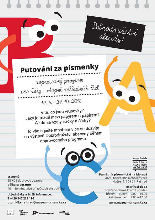 V úterý 12. dubna proběhne zahájení doprovodných programů k výstavě Dobrodružství abecedy. Tyto programy jsou určeny převážně školním kolektivům. Pro děti z mateřských škol, prvních i druhých stupňů základních škol i studenty středních škol jsou připraveny pracovní listy a výtvarné aktivity.