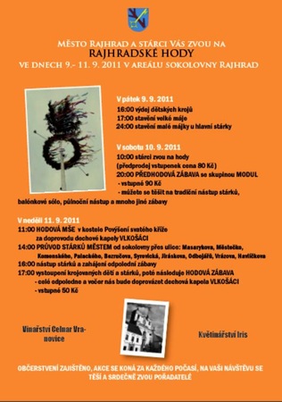 Město Rajhrad a stárci zvou na rajhradské hody, které začínají v pátek 9. září, kdy se bude stavět velká máj i malá májka. V sobotu večer bude od osmi hodin předhodová zábava se skupinou Modul. Návštěvníci se mohou těšit na tradiční nástup stárků, balónkové sólo, půlnoční nástup a na další zábavu. Vstupné je 90 korun.