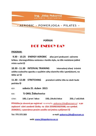 Od 9:30 do 10:25 budete mít možnost zkusit Energy aerobic, kde se budete pohybovat v kardiostylu a lektorka slibuje, že jediné tělo nezůstane suché.